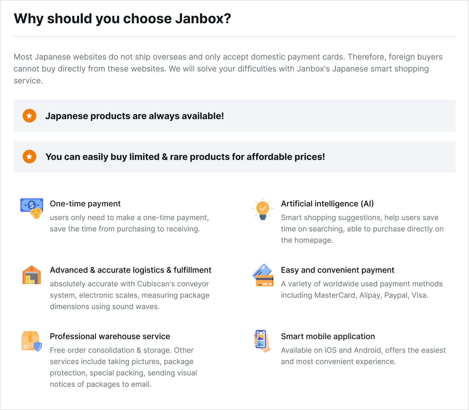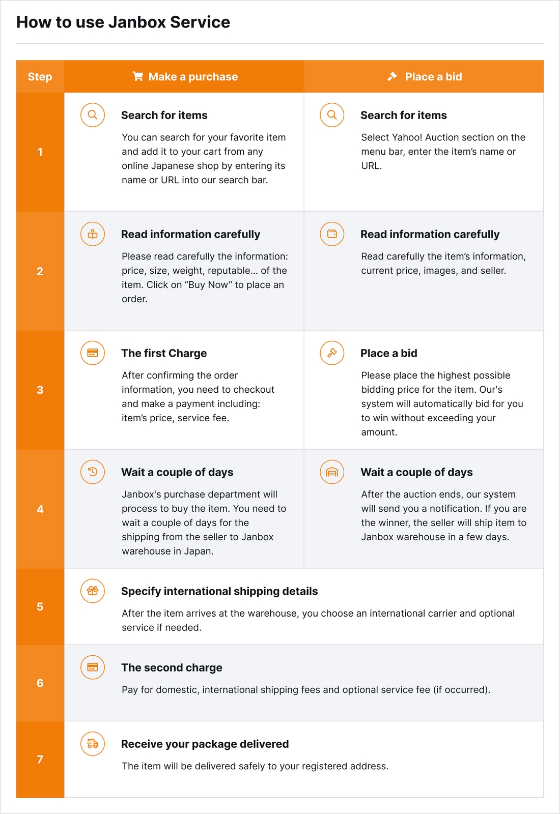 Janbox is a cross-border e-commerce platform that allows you to purchase and auction billions of items from Japan and the United States. We ship to over 220 countries across the world swiftly and easily, while also reducing shipping costs with our free repacking service.