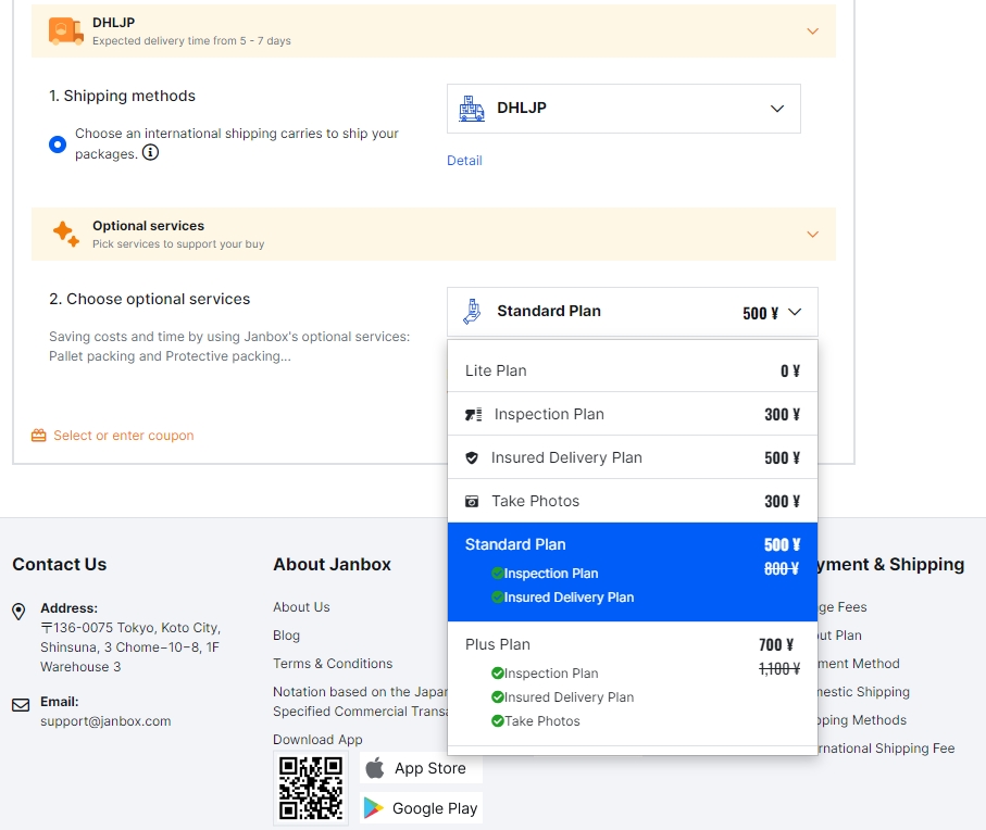 During order checking you need: - Choice of additional services: - Lite Plan - Standard Plan - Plus Plan - Inspection Plan - Insured Delivery Plan - Take Photos Choose international shipping: - EMS - Janbox Express ( For Vietnamese Users only) - DHL - Fedex