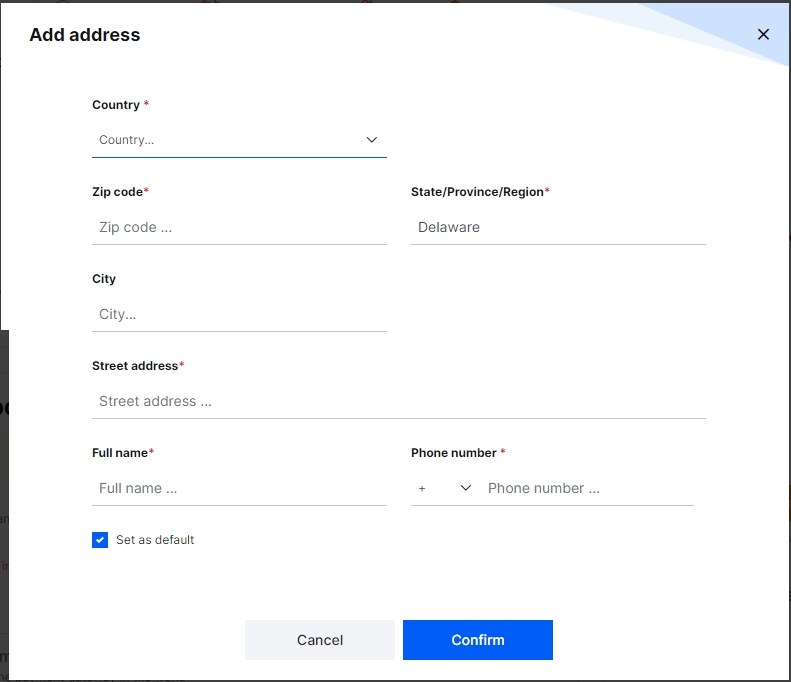 Fill in the following information: - Country. - Zip code. - State/Province/Region. - City. - Street address. - Full name. - Phone number.