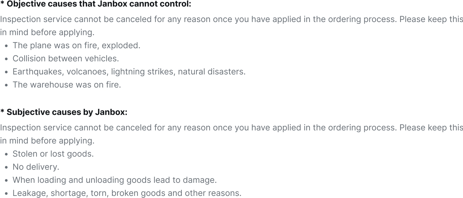 Janbox insures the value of the products for 100%. As a result, if clients utilize the cargo insurance service, Janbox is committed to indemnifying 100% of the products’ value based on the insurance coverage offered by Janbox in case the packages are lost or damaged. To reduce risks, we constantly advise our clients to purchase this additional service. 1.1 The insuredApplied for all Janbox’s products. Except for fragile products such as glasses, monitors, guitars, etc. 1.2 Insurance coverage Apply to products that have been visually damaged (partial or full damaged) or lost in transit: