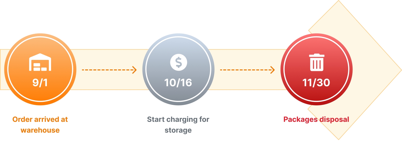 When parcels arrive at Janbox warehouse, they will be kept in storage for free within the first 45 days. The 46th day since the package arrival date, a storage extension charge based on the package weight will be calculated day by day as long as the parcel is stored at our warehouse. *** Note:** - Storage charge is calculated based on the weight of the product and the time it stays in the warehouse. _Storage charge: 5 JPY/kg/day_*.** - The maximum storage period is 90 days. After this time, the package(s) will be extinguished without any compensation. So being aware of storage period is crucial.