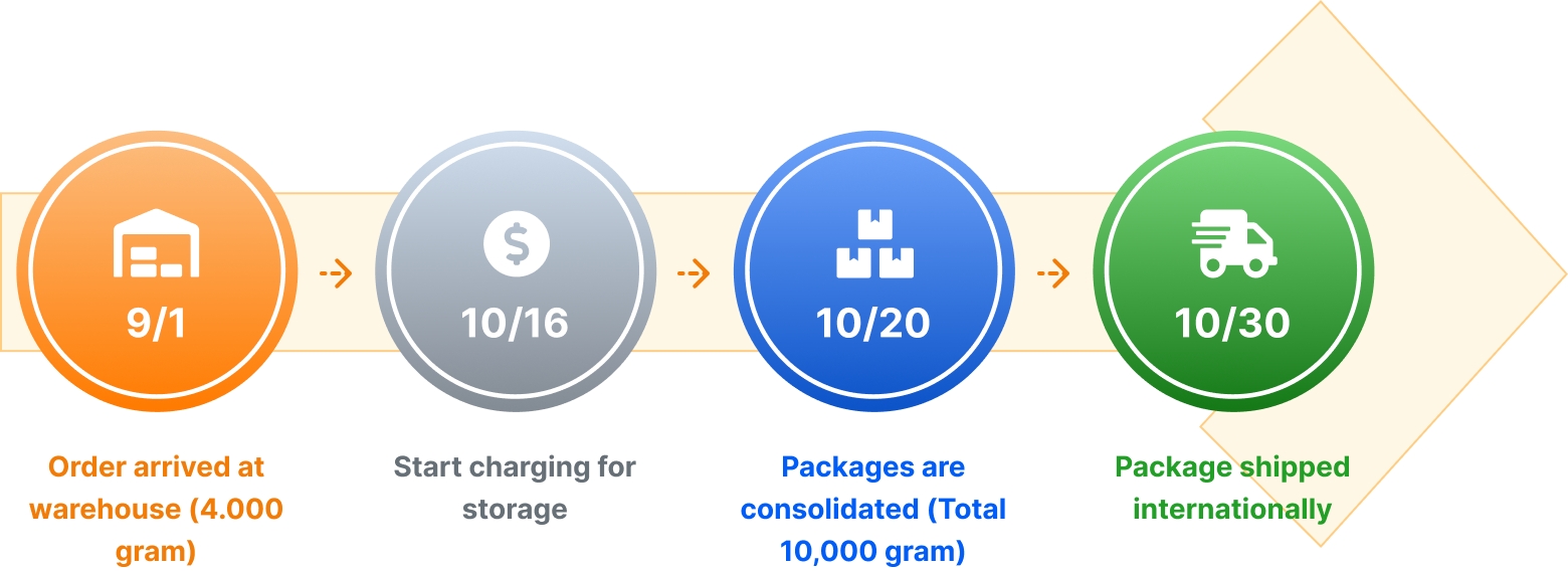 The consolidated package's maximum storage period will be calculated when the package is consolidated. Please notice that the storage fee might vary after consolidation since the storage extension fee is calculated by the package weight. For example, a package (4,000g) that has arrived at our warehouse on Septemper 1st and a package (6,000g) that has arrived on October 20th are consolidated on the same day, and then shipped out on December 10th. Storage charge will be paid together with international shipping fees. (Before consolidation) Storage extension fee 5 JPY x 4.000 gram x 4 storage days = 80 JPY (After consolidation) Storage extension fee 5 JPY x 10.000 gram x 5 storage days = 250 JPY Total storage fee: 80 JPY + 250 JPY = 330 JPY