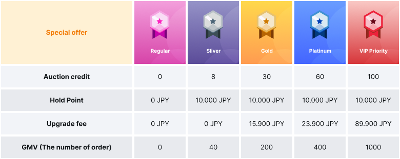 To be granted auction credit, customers can be considered in two ways: - Option 1: Upgrade member rank based on cumulative GMV (number of purchase orders). - Option 2: Buy member rank.