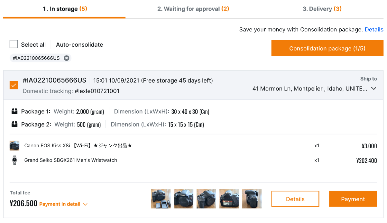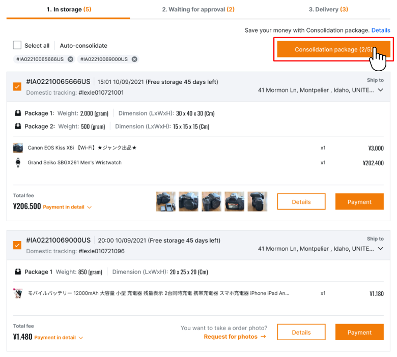 If you would like to add Package Consolidation, please choose the package you would like to add the service and then click the button “Package Consolidation”. The Package Consolidation Service is only available when you have two or more packages imported into Janbox warehouse. If you do not require optional services, please go to step 3.
