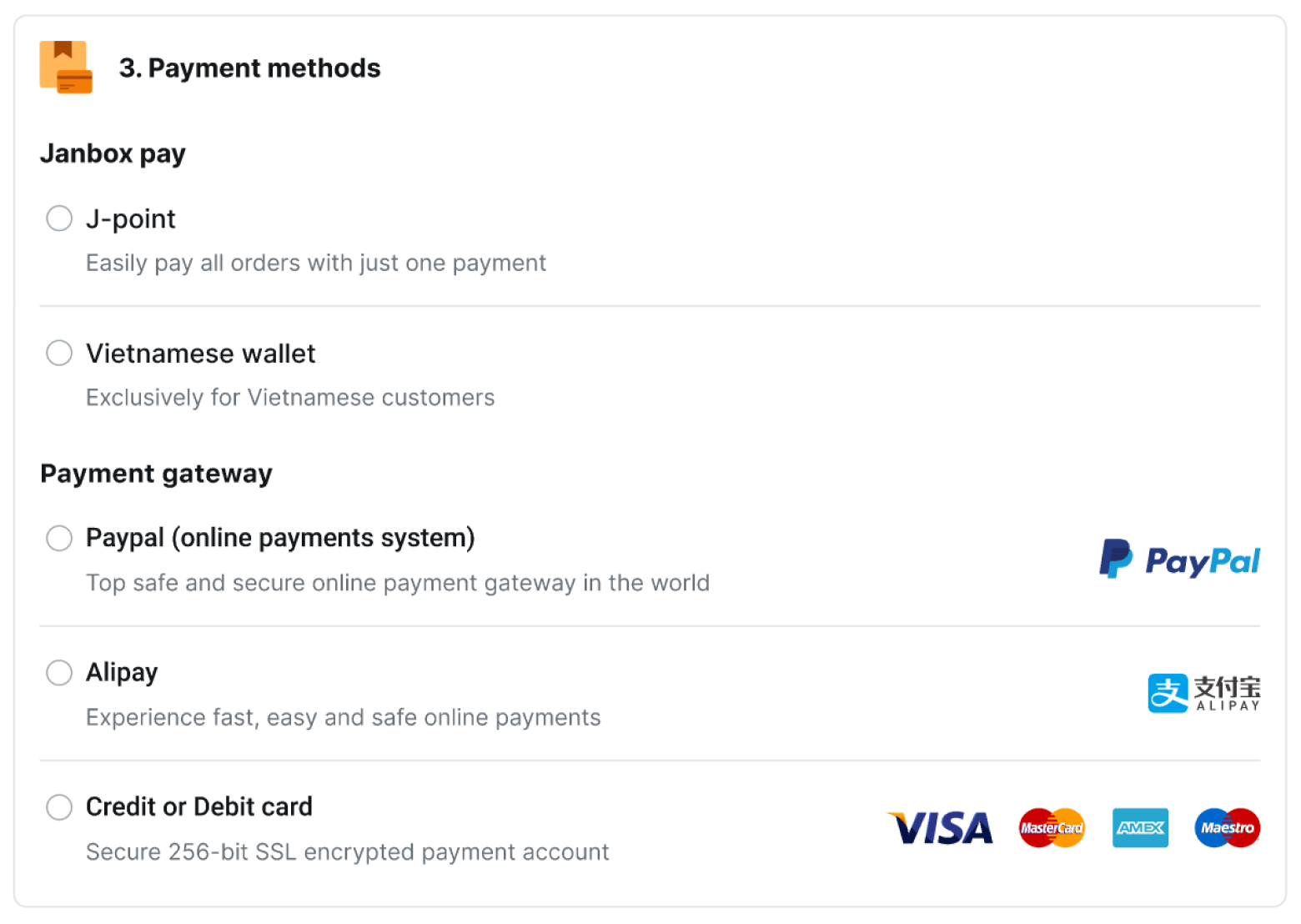 Please select payment method & Check your payment details and click the "Payment" button to complete your payment. After payment is completed, the package will be shipped internationally. *** Notice of Shipping High-Value Items:** _For packages whose total value is/exceeds 200,000 JPY, since customs inspections have become stricter, it's possible for the package to be returned to Janbox warehouse. In this case, Janbox will postpone the shipping of some of the packages by shipping packages on different days. _